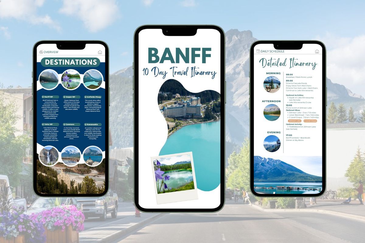Dive into the heart of Banff National Park with our 10-Day Ultimate Banff Itinerary, meticulously crafted for those who thrive on immersing themselves in nature. This comprehensive itinerary is your passport to exploring the park's most breathtaking landscapes. You'll also get to discover the best of Jasper National Park, Yoho National Park and Canmore. Each day is thoughtfully planned with a blend of outdoor activities and strategic relaxation times, ensuring you maximize every moment without feeling rushed.From the serene waters of Lake Louise for a morning paddle to stunning hikes and leisurely bike rides, our itinerary is packed with diverse activities to satisfy your adventurous spirit.Take the hassle out of trip planning with our mobile-friendly itinerary, complete with detailed daily schedules, options to tailor activities to your fitness level, and top dining spots to refuel and relax.We've mapped out everything, so you can focus on enjoying the beauty of the Canadian Rockies to the fullest. Included for Free: Restaurant Guide for Banff, Canmore, Lake Louise & Jasper! PRICE IS IN USD.