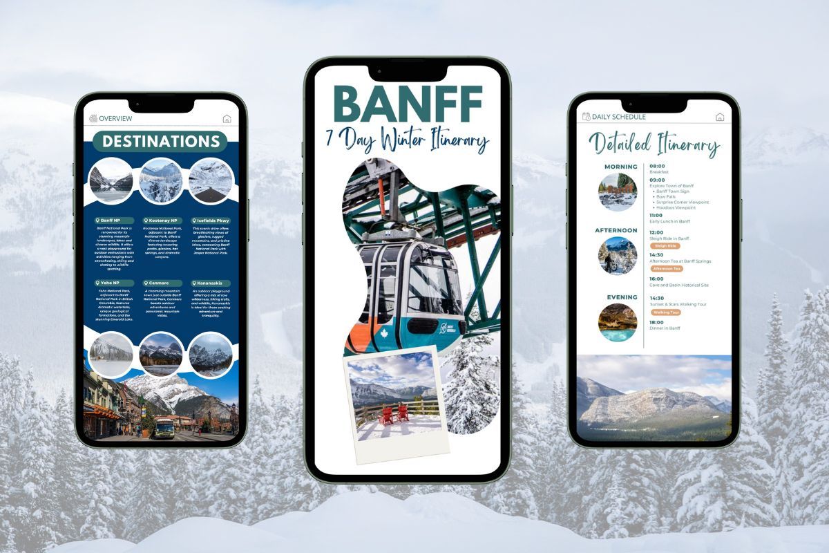 (BEST FOR TRAVEL MID-DECEMBER TO MARCH) Embark on a spectacular 7-day winter adventure through Banff National Park with our pre-built itinerary, designed for travelers eager to experience the breathtaking beauty of the Canadian Rockies. This itinerary takes the stress out of planning the perfect trip to the stunning landscapes of Banff National Park, Yoho National Park, and the charming town of Canmore. Carefully crafted for a balance of thrilling winter activities and rejuvenating downtime, each day is filled with unforgettable experiences without feeling overwhelming.Whether you’re skating on the frozen surface of Lake Louise, snowshoeing scenic trails, or exploring Banff's picturesque viewpoints, this itinerary offers activities for everyone to enjoy!Simplify your travel plans with our user-friendly Banff itinerary, featuring complete daily schedules, customizable activities tailored to your interests and fitness level, and top recommendations for dining and relaxation.Everything is set for you to dive into the winter wonderland of the Canadian Rockies—just pack your bags and prepare to be amazed! Included for Free: Restaurant Guide for Banff, Canmore, Lake Louise & Jasper! PRICE IS IN USD.