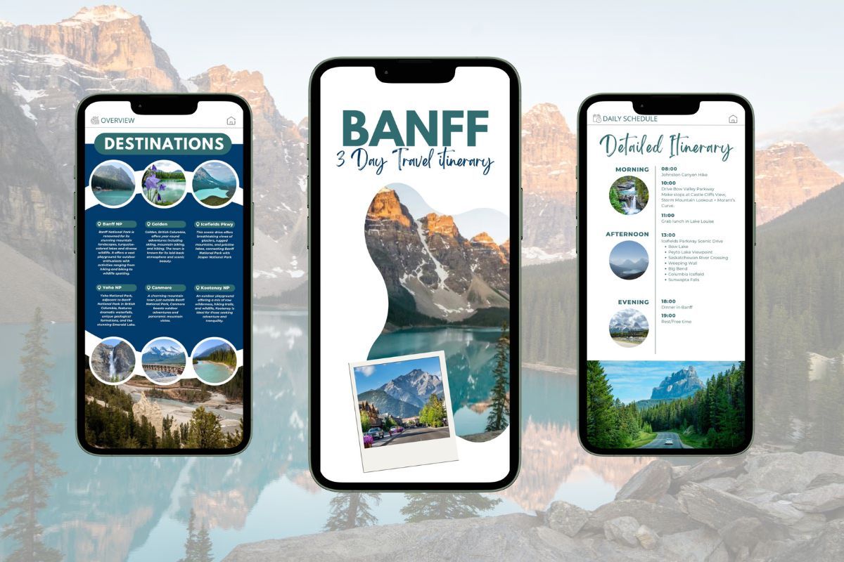 Explore the best of Banff National Park with our 3-Day See-It-All Itinerary, designed to allow you to see all the top places around Banff National Park. This itinerary is perfectly tailored for those looking to explore the highlights of Banff National Park and its surroundings without any extensive hiking.Our itinerary includes detailed daily schedules, optional activities, and dining recommendations. Let us take the stress out of planning your trip with our mobile itinerary, ensuring you don't miss a thing in Banff National Park! Included for Free: Restaurant Guide for Banff, Canmore, Lake Louise & Jasper! PRICE IS IN USD.