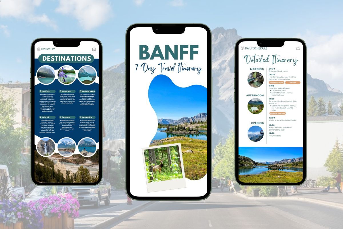 Embark on a spectacular 7-Day Adventure through Banff National Park with our car-free itinerary, perfect for those eager to experience the splendor of the Canadian Rockies without the stress of driving or parking. This itinerary takes the stress out of planning the ultimate trip to the awe-inspiring landscapes of Banff National Park, Yoho National Park, Kootenay National Park and Canmore.Our itinerary is carefully crafted, balancing fun adventures in nature with ample downtime to rejuvenate, ensuring every day is fulfilling but not overwhelming.Whether you’re canoeing on the tranquil waters of Lake Louise, hiking scenic trails, or cycling through picturesque routes, our schedule has activities and options for everyone!Simplify your trip planning with our user-friendly mobile itinerary, which includes complete daily plans, customizable activities to match your fitness level, and the best spots for dining and relaxation. Plus exactly how to get around Banff National Park WITHOUT A CAR! We've detailed all the bus routes and stops so you don't need to.Everything’s set for you to dive into the natural beauty and excitement of the Canadian Rockies without the stress of planning. Just pack your bags and prepare to be amazed. Included for Free: Restaurant Guide for Banff, Canmore, Lake Louise & Jasper! PRICE IS IN USD.